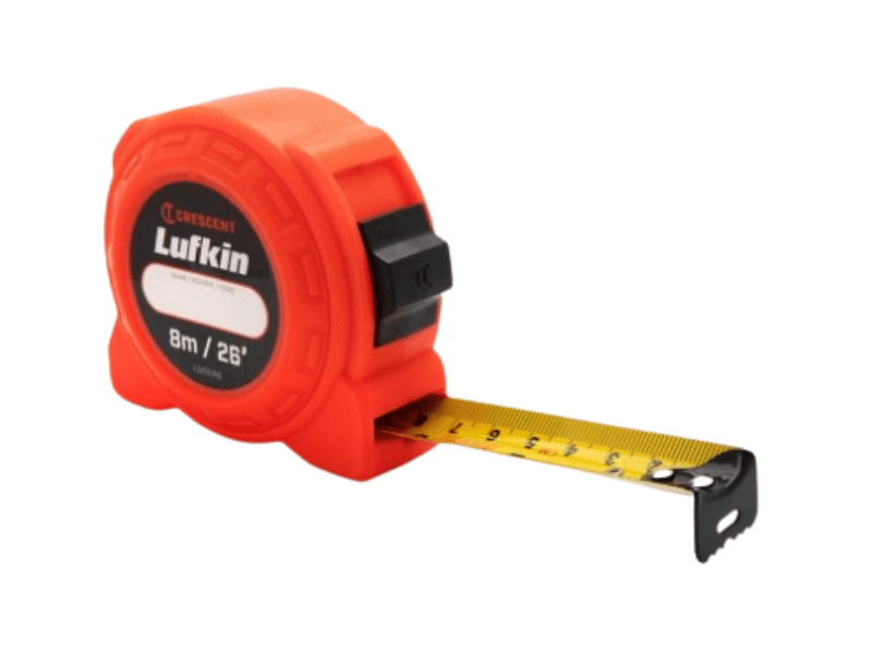 Cinta en acero con revestimiento epoxico freno y botón pisador par fijar la cinta, 8 metros numeración consecutiva en metros y pulgadas.
